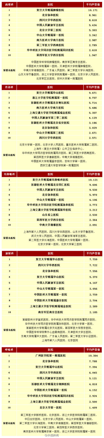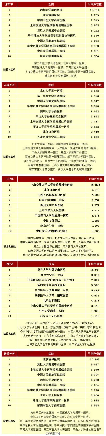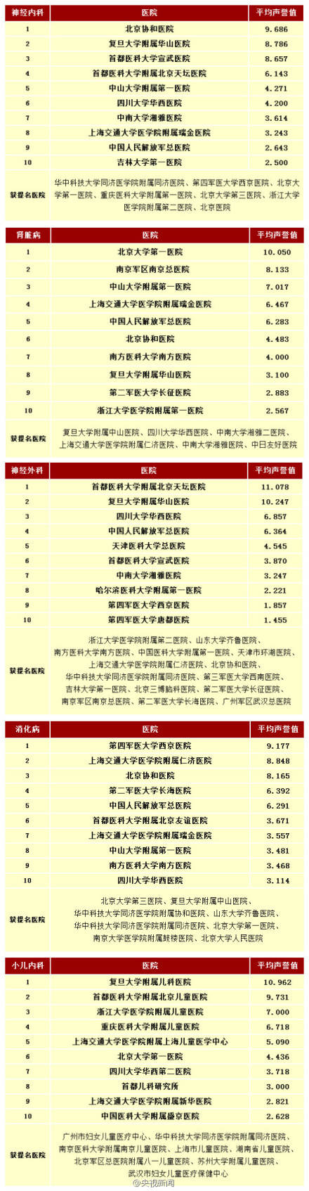复旦大学还同时发布了《2013年度中国医院最佳专科声誉排行榜》:①妇产科:协和医院 ②骨科:北京积水潭医院 ③口腔科:北大口腔医院 ④内分泌:上海交大瑞金医院 ⑤皮肤科:复旦华山医院 ⑥心血管:北京阜外医院 ⑦神经内科:协和医院 ⑧肾脏病:北大第一医院 ⑨小儿内科:复旦儿科 ⑩小儿外科:北京儿童医院。