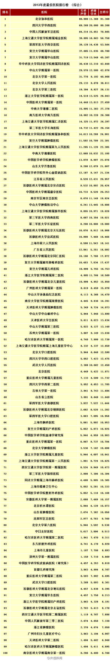 复旦大学发布《2013年度中国最佳医院综合排行榜》,榜单由全国30个临床专科2047名著名专家学者参与评审。全国100家医院上榜,北京协和医院、四川大学华西医院和中国人民解放军总医院名列前3。2013年度最佳医院排行榜