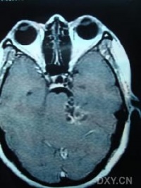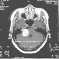 (2)CT及MRI扫描:CT表现为瘤体呈等密度或低密度,少数呈高密度影像。肿瘤多为圆形或不规则形,位于内听道口区,增强效应明显。MRIT1加权像上呈略低或等信号,在T2加权像上呈高信号。第四脑室受压变形,脑干及小脑亦变形移位。注射造影剂后瘤实质部分明显均一强化,囊变区不强化。