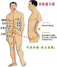 [循行部位] 起于胞中,并在此分为三支:一支沿腹腔后壁,上行于脊柱内;一支沿腹腔前壁挟脐上行,散布于胸中,再向上行,经喉,环绕口唇;一支下出会阴,分别沿股内侧下行至大趾间。