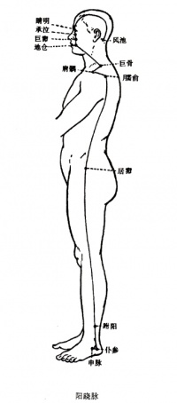 循行:①起于足跟外侧,②经外踝上行腓骨后缘,没股部外侧和胁后上肩,过颈部上挟口角,进入目内眦,与阴蹻脉会合,再沿足太阳经上额,③与足少阳经合于风池。