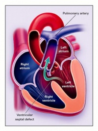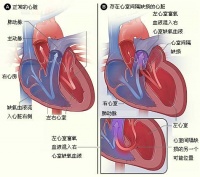 图A为正常的心脏结构及其内部的血流情况。图B显示了有心室间隔缺损的两个常见位置,而心室间隔缺损(VSD)导致了左心室富氧血液与右心室缺氧血液的混合。