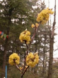 3.木姜子,落叶小乔木,高3-7m。花枝细长。叶簇聚于枝端,纸质,披针形或倒披针形,长5-10cm,初有绢丝状短柔毛,后渐变为平滑;叶柄有毛。花单性,雌雄异株;伞形花序,由8-12朵花组成,具短梗;花先于叶开放;总苞片表面有毛,早落;花黄色,花梗细小,长1-1.5cm,有绢丝状粗毛;花被6,倒卵形;花药4室,瓣裂,全内向,花丝仅于基部有细毛;雌花较大,有粗毛。核果球形,蓝黑色,直径约7-10mm;果梗上部稍肥大。花期3-4月。果期8-9月。