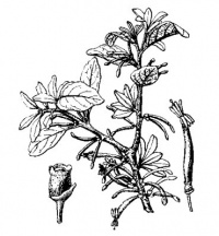 灌木,高0.5-1米,全株无毛;二年生枝条黑色,具光泽。叶互生,有时近对生或数枚簇生于短枝上,革质,卵形、长卵形、长椭圆形或披针形,长3-5厘米,宽1.5-2厘米,顶端圆钝,基部楔形,稍下延;侧脉3-4对,叶柄长2-4毫米。伞形花序,1-2个腋生或生于小枝已落叶腋部,具花2-4朵,总花梗长1-2毫米或几无,花梗长4-6毫米;苞片卵圆形,长约2毫米;花红色,花托椭圆状,长约2.5毫米;副萼环状,全缘或具4浅齿,稀具撕裂状芒;花冠花蕾时管状,长2-3厘米,稍弯,顶部椭圆状,裂片4枚,披针形,长6-9毫米,反折;花丝长约2毫米,花药长3-4毫米;花柱线状,柱头头状。果椭圆状,长8-10毫米,直径4毫米,黄色或橙色。花期2-7月,果期5-9月。