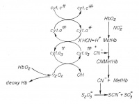 其毒性跟CN离子对重金属离子的超强络合能力有关。CN 主要跟细胞色素P450中的金属离子结合,从而使其失去在呼吸链中起到的传递电子能力,进而使中毒者死亡。氰化物中毒一般都很迅速。临床上常用的抢救方法是用硫代硫酸钠溶液进行静脉注射,同时使那些尚有意识的病人吸入亚硝酸异戊酯进行血管扩张来克服缺氧。常见的氰化物中毒原因是误食含氰果仁儿,比如生桃仁儿等。