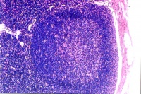 当受到抗原刺激时,生发中心迅速增大,并有大量巨噬细胞聚集。在发育充分及免疫应答活跃的次级淋巴小结的中央有明显的生发中心,多呈圆形或椭圆形,直径约0.1~1.0mm,是有极性的结构。由内向外可区分出暗区和明区二部分。暗区(darkzone)是生发中心的内侧份,主要由幼稚的大淋巴细胞密集而成,胞质嗜碱性强,故染色较深,在大淋巴细胞之间也可见吞噬啐屑的巨噬细胞和装细胞;明区(lightzone)是生发中心的外侧份,含有较多的网状细胞、巨噬细胞、滤泡树突细胞称中等大的淋巴细胞,这些淋巴细胞是由暗区的大淋巴细胞转化而来,细胞分有松散,放着色较淡;在生发中心的顶部及周围有一层密集的小淋巴细胞称为帽(cap)或小结帽,这些小淋巴细胞多为B记忆淋巴细胞和浆细胞的前身,分布在生发中心的顶部和周围,着色较深、形似新月。小结帽多位于淋巴流入的方向,或朝向抗原进入的方向,为最先接触抗原的部位。淋巴小结的形态和结构不是固定不变的,抗原刺激与否及抗原刺激程度均影响到淋巴小结出现的数量和形态结构,因此、淋巴小结是反映体液免疫应答的重要形态学标志。