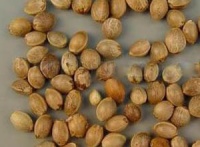【性状】本品果实呈卵圆形,长4~5.5mm,直径2.5~4mm。表面灰绿色或灰黄色,有微细的白色或棕色网纹,两边有棱,顶端略尖,基部有1圆形果梗痕。果皮薄而脆,易破碎。种皮绿色,子叶2,乳白色,富油性。气微,味淡。