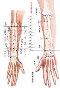 • 手指比量法是用手指或手指的某一部位作为比量腧穴部位的方法。其中,用中指中节两端横纹头之间距离(屈指时)作1寸的,称中指同身寸法。用拇指指节横纹两端之间距离作1寸的,称拇指同身寸法。用食、中、环、小四指相并作为3寸的称一夫法