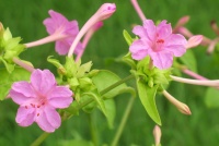 胭脂花,学名紫茉莉,属紫茉莉料。因花朵紫红,香如茉莉,因而得名。又因为其花傍晚开放,馨香宜人, 在北方一些地方,也被称为“夜来香”。 胭脂花不仅幽香,其种子和叶尚有美容、清热和解毒的功效。种子成熟时,外观黑色如球形,内呈白色。美容时可采取成熟种子若干,研成粉末,去皮后取粉搽脸,可除面斑等,使面部光洁、白皙,收美容之功效。 另外,手面上生有水泡疮时,亦可取粉加水调匀抹于患处,收除湿解毒之功效。当皮肤创伤或行痈疮时,摘取胭脂花鲜叶数片,捣烂敷于创处患处即可。该花为多年生草花,也可作一年生栽培,春夏之际播种,两月左右即可放花。且一旦播种,年年花开不绝。花期在6月至9月间;但由于广州地区气候温暖,花期常延长,为5月至10月。花色以紫红最为常见,还有黄、白等色。胭脂花生长健壮,极易成活。而且有抗二氧化硫的特性,因此无论居民阳台或工矿污染区均可栽植。家庭养殖时,若能不时以洗肉鱼水、淘米水浇之,则花开更旺,花色愈艳。胭脂花花朵娇艳,清香宜人,兼可妙用于人,诚为佳卉也。