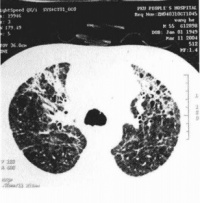 - 巨细胞病毒性肺炎(CMV肺炎):此病在机体免疫功能正常时发生较少,而器官移植后的患者由于长期使用免疫抑制剂,常发生CMV肺炎。其进程凶险,85%患者在2-4周内死亡。确诊主要靠检测CMV抗原、CMV IgM抗体增高或IgG 4倍增高等。目前无人群机体发病的报道,综合临床资料,不难与SARS鉴别。