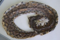 药材卷曲成圆盘形,头在中央稍向上,盘径17~34cm。头部呈三角形而扁平,鼻尖向上。背部两侧各有黑褐色与浅棕色组成的“∧”形大斑纹24个,其中“∧”形的顶端在背中线上相接(即24方胜纹),其中部分左右并不相接,而是交错排列。腹部撑开或不撑开,灰白色,鳞片较大,有黑色类圆形的斑块(俗称念珠斑)。尾部渐细,末端呈三角形深灰色的角质鳞片一枚。腹内壁黄白色,脊椎骨显露突起,两侧具有多数肋骨。气腥臭,味微咸。