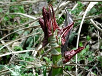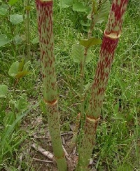 虎杖在川北、甘南,凡河沟浸润处,几处处有之。蓼科,丛生,茎高1~2米,直立如杖,色绿,中空,有斑点如血,叶圆如杏叶而大。四川民间称作“花斑竹”、“雄黄连”,前者言其植物形态,似竹而有花斑;后者可能是因为它有清热泻火作用。广东则名之为“大叶蛇总管”,意即可用于蛇咬伤。