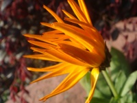 金盏菊株高30~60cm,为二年生草本植物,全株被白色茸毛。单叶互生,椭圆形或椭圆状倒卵形,全缘,基生叶有柄,上部叶基抱茎。头状花序单生茎顶,形大,4-6cm,舌状花一轮,或多轮平展,金黄或桔黄色,筒状花,黄色或褐色。也有重瓣(实为舌状花多层)、卷瓣和绿心、深紫色花心等栽培品种。花期12-6月,盛花期3-6月。瘦果,呈船形、爪形,果熟期5-7月。