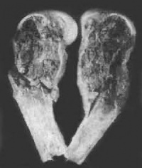 X线片表现:骨骺处有局限的囊性改变,一般呈溶骨性破坏,也可有“肥皂泡”样改变,其扩展一般为软骨所限。不破入关节,少有骨膜反应,肿瘤范围清楚,初发时病变在骨骺内旁侧,发展后可占骨端的全部,骨皮质膨胀变薄,有的可以穿破,进入软组织。X线片可显示其一般特点,但仍不足以确诊。