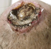 尤其是皮肤与粘膜交界处更易发生。初起为暗红色坚硬的疣样小结节,表面毛细血管扩张,中央有角质物附着,不易剥离,用力剥后可出血。皮损逐渐扩大,形成坚硬的红色斑块,表面有少许鳞屑,边境清楚,向周围浸润,触之较硬,迅速扩大形成溃疡,溃疡向周围及深部侵犯,可深达肌肉与骨骼,损害互相粘连形成坚硬的肿块,不易移动,溃疡基底部为肉红色,有坏死组织,有脓液、臭味,易出血。溃疡边缘隆起外翻,有明显炎症,自觉疼痛。如发生在皮肤与粘膜交界处,固潮湿与摩擦更易出血,发展更快,可形成菜花状,破坏性大,有明显疼痛,易转移,预后不良。