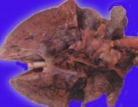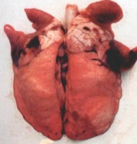肺表面苍白,含水量增多,切面有大量液体渗出。显微镜下观察,可将其分为间质期,肺泡壁期和肺泡期。