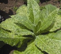 俗称聋烟、疯烟、青花、油头。烟草植株染病后,幼嫩叶片侧脉及支脉组织呈半透明状,即明脉。叶脉两侧叶肉组织渐呈淡绿色。病毒在叶片组织内大量增殖,使部分叶肉细胞增大或增多,出现叶片薄厚不匀,颜色黄绿相间,呈花叶状。后花叶斑驳程度加大,并现大面积深褐色坏死斑,中下部老叶尤甚,发病重的叶片皱缩、畸形、扭曲。早期发病的植株节间缩短,严重矮化,生长缓慢,不能正常开花结实。并易脱落。能发育的荫果小而皱缩,种子量少且小,多不能发芽。