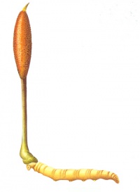 先端小部外,密生多数子囊壳;子囊壳大部陷入子座中,先端凸出于子座之外,卵形或椭圆形,长250~500微米,直径80~200微米,每一子囊壳内有多数长条状线形的子囊;每一子囊内有8个具有隔膜的子囊孢子。寄主为鳞翅目、鞘翅目等昆虫的幼虫,冬季菌丝侵入蛰居于土中的幼虫体内,使虫体充满菌丝而死亡。夏季长出子座。分布四川、云南、贵州、甘肃、青海、西藏等地。夏至前后,当积雪尚未溶化时入山采集,此时子座多露于雪面,过迟则积雪溶化,杂草生长,不易找寻,且土中的虫体枯萎,不合药用。挖起后,在虫体潮湿未干时,除去外层的泥土及膜皮,晒干。或再用黄酒喷之使软,整理平直,每7~8条用红线扎成小把;用微火烘干。冬虫夏草为虫体与菌座相连而成,全长9~12厘米。虫体如三眠老蚕,长约3~6厘米,粗约0.4~0.7厘米。外表呈深黄色,粗糙,背部有多数横皱纹,腹面有足8对,位于虫体中部的4对明显易见。断面内心充实,白色,略发黄,周边显深黄色。菌座自虫体头部生出,呈棒状,弯曲,上部略膨大。表面灰褐色或黑褐色,长可达4~8厘米,径约0.3厘米。折断时内心空虚,粉白色。微臭,味淡。以虫体色泽黄亮、丰满肥大、断面黄白色、菌座短小者为佳。主产青海、西藏、四川、甘肃、云南、贵州,以西藏那曲和青海玉树所产冬虫夏草质量最佳。