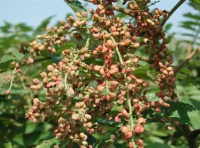 落叶小乔木或乔木,高2~10m。树皮灰黑色;小枝密被棕色柔毛。奇数羽状复叶,互生,总叶柄基部膨大,叶轴与总叶柄有宽翅,被淡黄色棕色短柔毛;小叶5~13枚,卵形、卵状椭圆形至椭圆形或长卵形,长5~14cm,宽2.5~5cm,先端渐尖、短渐尖或急尖。基部圆形或楔形,边缘有粗锯齿,上面绿色,疏生短柔毛,下面灰绿色,密被淡褐色短柔毛;无小叶柄。圆锥花序顶生,长20~30cm,花小,兼有两性花和雄花;两性花的萼片5,绿黄色,长卵形,长约0.6mm,先端钝,外侧及边缘被短柔毛;花瓣5,白色,倒卵状长椭圆形,长1.6mm,先端圆形,边缘及内侧基部具柔毛;雄蕊5,着生于花盘边缘,较花瓣略短,花药黄色,椭圆形,“丁”字着生,花丝黄色;雌蕊较雄蕊短,子房上位,密生长柔毛,花柱3,柱头头状,黄色;雄花略小于两性花,花萼、花瓣与两性花相似,雄蕊5,形小,中央有退化子房。果序直立;核果扁果形,直径约3~4mm,熟时橙红色至红色,被灰白色短柔毛,内含种子1枚,扁圆形,灰色。花期6~9月,果期9~11月。