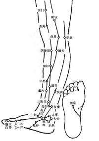 【取法】正坐垂足或仰卧位,在内踝前下方凹陷处。当舟骨结节与内踝高点连线之中点处取穴。