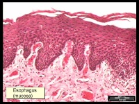 粘膜层,包括上皮固有层和粘膜肌层。上皮为较厚的未角化的复层扁平上皮,耐摩擦,有保护作用。在食管与胃贲门交界处,复层扁平上皮突然变成单层柱状上皮;固有层为致密结缔组织,内有食管腺导管;粘膜肌层由纵行肌组成。
