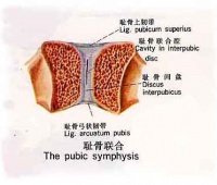 由两侧的耻骨联合面藉纤维软骨连接而成。上、下面及前面都有韧带加强,上方的叫耻骨上韧带,下方的叫耻骨弓状韧带。纤维软骨中间有一纵裂隙,叫做耻骨联合腔,但无滑膜覆盖,所以有人将耻骨联合算做半关节。女性的耻骨联合有一定的可动性,在妊娠或分娩过程中,耻骨联合可出现轻度的分离,使骨盆发生暂时性的扩大。