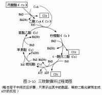 乙酰CoA和草酰乙酸缩合成有三个羧基的柠檬酸, 柠檬酸经一系列反应, 一再氧化脱羧, 经α酮戊二酸琥珀酸, 再降解成草酰乙酸。而参与这一循环的丙酮酸的三个碳原子, 每循环一次, 仅用去一分子乙酰基中的二碳单位, 最后生成两分子的CO2 , 并释放出大量的能量。