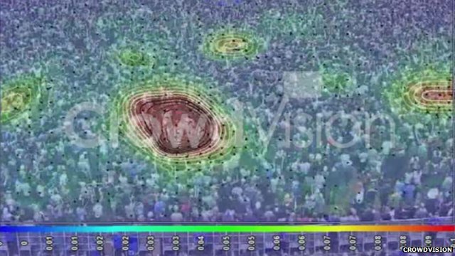 近些年,基于视频监控的人群拥挤防控措施也取得了很大进步。比如沙特政府为麦加引入了一整套高科技的踩踏预防体系,使得每年朝圣人群踩踏事故大幅度的减少了。下图为来自CROWDVISION公司的人流拥挤预警系统,图片来自BBC。