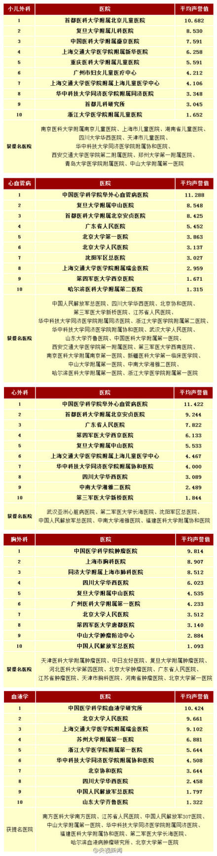 复旦大学还同时发布了《2013年度中国医院最佳专科声誉排行榜》:①妇产科:协和医院 ②骨科:北京积水潭医院 ③口腔科:北大口腔医院 ④内分泌:上海交大瑞金医院 ⑤皮肤科:复旦华山医院 ⑥心血管:北京阜外医院 ⑦神经内科:协和医院 ⑧肾脏病:北大第一医院 ⑨小儿内科:复旦儿科 ⑩小儿外科:北京儿童医院。